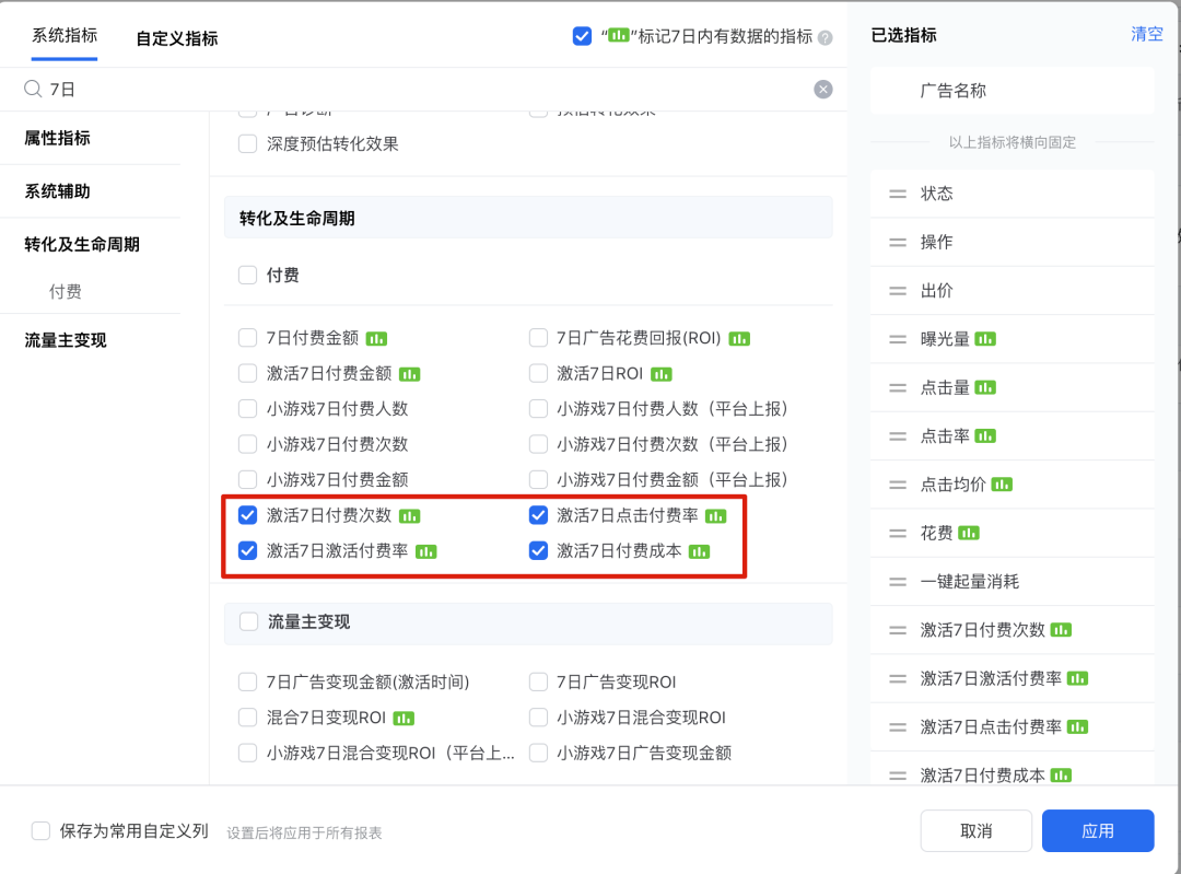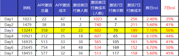 首先關(guān)注【激活7日付費(fèi)成本】是否達(dá)標(biāo),其次關(guān)注【激活7日ROI】是否達(dá)標(biāo),是否對(duì)比其它優(yōu)化方式有提升,同時(shí)輔助關(guān)注【首日ROI】和【激活成本】。