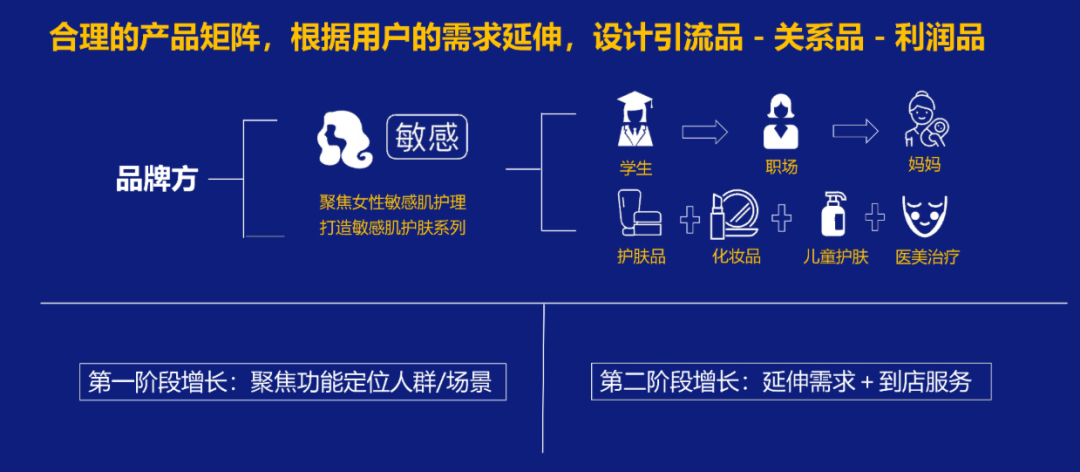 從這個核心消費前提出發(fā),我們可以將需求拆分出 3個階段:1) 第一階段(引流單品),純粹的敏感肌舒敏切入-打出舒敏管理的大單品2) 第二階段(延伸需求),根據(jù)用戶不同階段「學生」、「職場人」、「產(chǎn)齡」、「寶媽」定義產(chǎn)品組合規(guī)劃。比如學生主打舒敏護膚品,職場會在這基礎(chǔ)下增補不敏感的化妝品,媽媽則會補充一條babycare線產(chǎn)品,醫(yī)美則推出高效的術(shù)后護理,還有「抗初老」、「抗衰老」產(chǎn)品,不斷從各個場景做高單個用戶的客單價。3) 第三階段,科學化的通過社群及用戶的新產(chǎn)品投放測試,通過KOC及用戶反饋研發(fā)和增補產(chǎn)品線,同步緊捉用戶變美變好的馬斯洛終極需求,引入一批海外的高端營養(yǎng)保健品擴大用戶的消費需求場景。市場上絕大部分品類,都集中在幫用戶解決第一階段的問題。但是一旦我們換個視角,從整個消費鏈條來看,第一階段與二階段之間,完全可以衍生出「舒敏特護霜」這個長周期、高復(fù)購的品類。所以在我們后續(xù)的舒敏產(chǎn)品運營過程中,我們會持續(xù)對社群內(nèi)用戶,進行持續(xù)性的優(yōu)惠推送,以及其他衍生品類的認知植入。甚至更進一步,圍繞用戶的特定屬性,我們也可以作其他延展。譬如寶媽群體來說,在過往的調(diào)查中發(fā)現(xiàn), 70 %的嬰兒用戶存在濕疹問題,這是我們藥妝品類可以切入的一個核心賣點。以白領(lǐng)群體為例,由于她們在日常工作中化妝頻次特別高,我們還能繼續(xù)向上拓寬產(chǎn)品矩陣,推出與化妝品搭配的降敏產(chǎn)品。在產(chǎn)品質(zhì)量有保障的基礎(chǔ)上,面對單一品類的用戶,我們的運營動作既可以通過深度服務(wù)與教育,也可以圍繞核心需求做品類延展。根本目的都是要設(shè)計一套從引流到留存到轉(zhuǎn)化的科學策略,將用戶往整體的矩陣消費引導(dǎo),提升他的整體客單與復(fù)購頻次。04