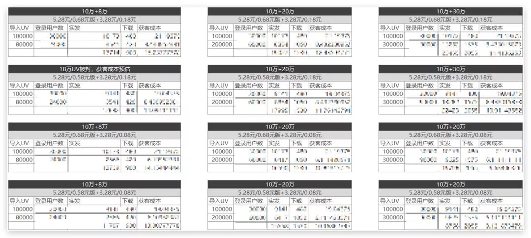 附個(gè)小圖:以下是我們做紅包活動(dòng)時(shí),根據(jù)不同時(shí)期的訪問量和下載量,預(yù)估并控制整個(gè)活動(dòng)的獲客成本,可以參考下。