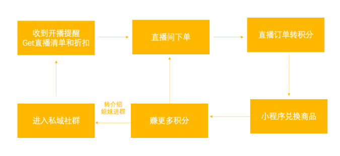 如此一來,從引導(dǎo)用戶進入私域,私域反補直播間流量,直播間訂單轉(zhuǎn)化私域積分,私域積分反向催生直播間訂單,好的私域體驗催生用戶口碑裂變轉(zhuǎn)介紹……
