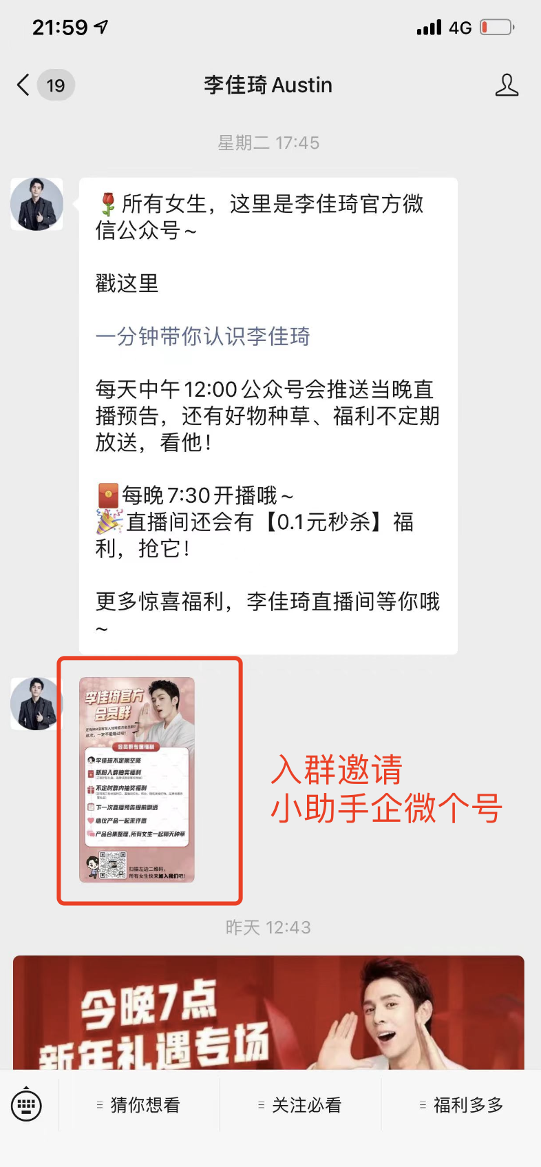 而我們關(guān)注公眾號之后,會馬上收到公眾號的關(guān)注后自動回復(fù)。回復(fù)內(nèi)容中,就有一張引導(dǎo)用戶加入李佳琦直播會員群的福利tips,以及小助手的企業(yè)微信二維碼。