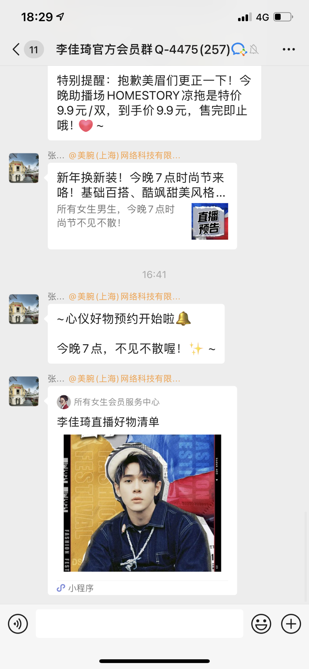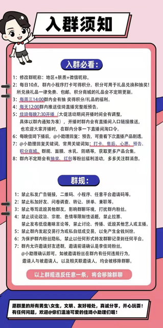 在這一點上,李佳琦用了最輕量化運營的策略,將社群作為單向的服務(wù)通知群,群內(nèi)推送sop化,定點推送開播預(yù)告、開播預(yù)約等文案和鏈接,定時推送相關(guān)抽獎活動、積分活動。