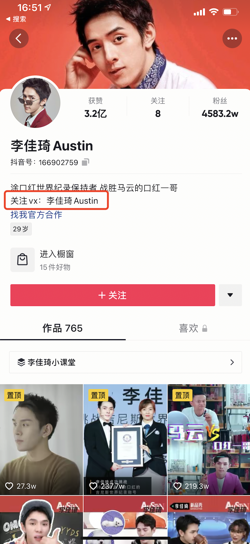 其他幾個渠道,我們不管在個性簽名,還是評論區(qū),都難見到官方的引流痕跡。但從僅有的一個渠道引流文上,也就是抖音的個性簽名中,我們就能看到李佳琦團隊的引流妙招——全網(wǎng)統(tǒng)一的IP名稱“李佳琦Austin”。