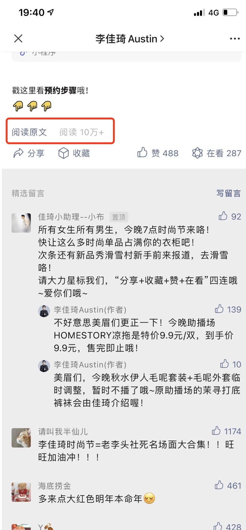 李佳琦私域的用戶粘性如何?可以看看這個數(shù)據(jù):李佳琦當天下午1點發(fā)布的公眾號文章,在當晚7點半開播前,每一篇都能在幾小時內(nèi)達到10萬+。