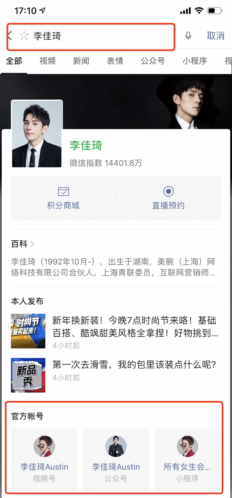 在搜索結(jié)果中,我們可以看到3個官方賬號,其視頻號和小程序,都在非常醒目的位置,有意將用戶引導(dǎo)至公眾號。
