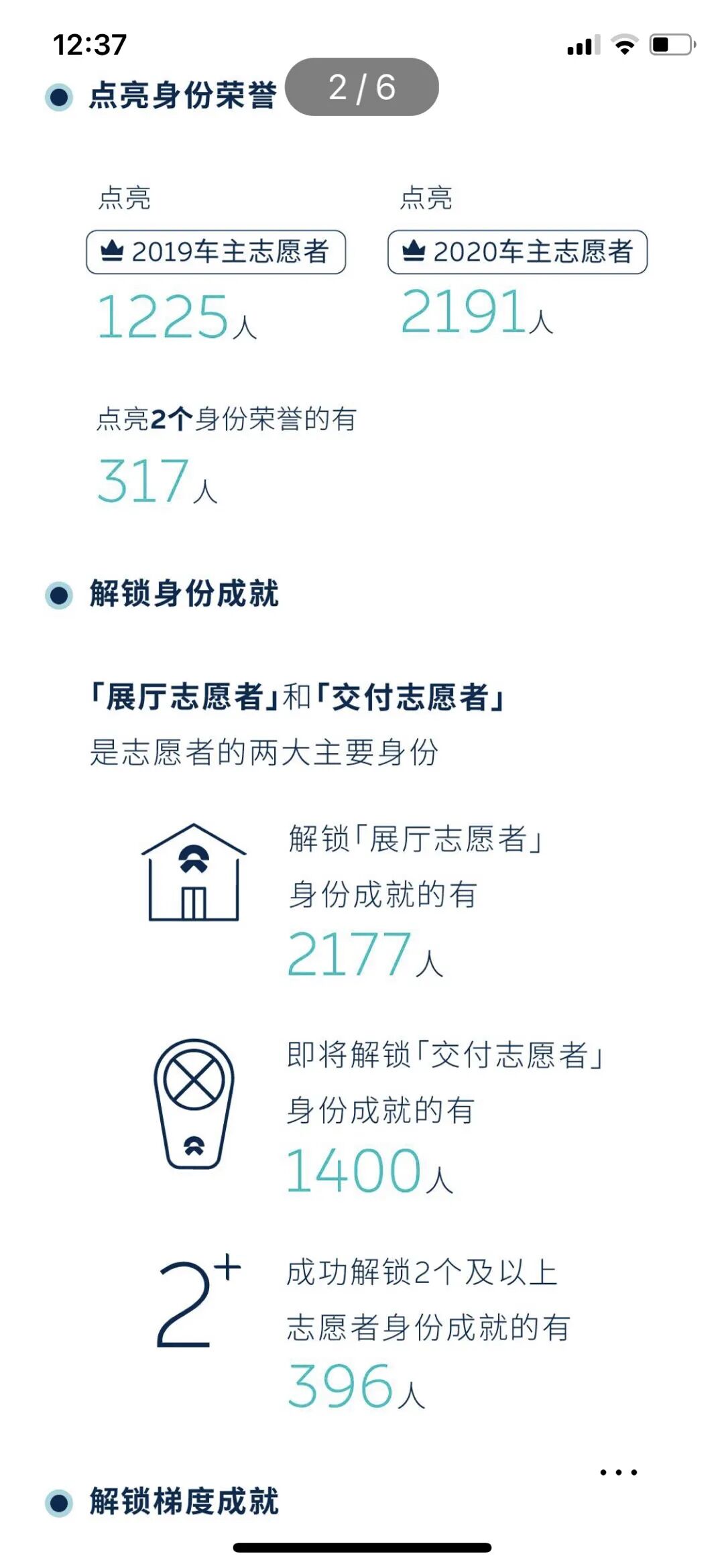 為了增強這種信任感,蔚來用積分作為鉤子,招募不少“車主志愿者”,輔助完成線下銷售和交付工作。這些志愿者不僅會出現(xiàn)在大型活動上,比如上海國際國際車展,還會在各個門店進行協(xié)助,在咨詢、提車等各個環(huán)節(jié)和新車主進行溝通。成為車主志愿者后,該用戶的 App ID 上還會掛上 一個 Tag,可以標(biāo)明自己是哪一年、參加什么活動(例如上海車展)的志愿者。對用戶表達(dá)認(rèn)可的最佳方式,就是肯定他們的某種成就或者行為,哪怕只是很小的認(rèn)可,用戶都能感知到被這家公司所重視。因此,這種做法不僅能讓老用戶獲得一些物質(zhì)上獎勵,還能讓其擁有成就感、參與感,最終形成口碑營銷。而對于潛在的用戶而言,老用戶現(xiàn)身說法,更加增強了用戶對品牌的信任感,從而愿意為其買單。不少車主會“秀”自己的志愿者標(biāo)簽,并以此為榮。