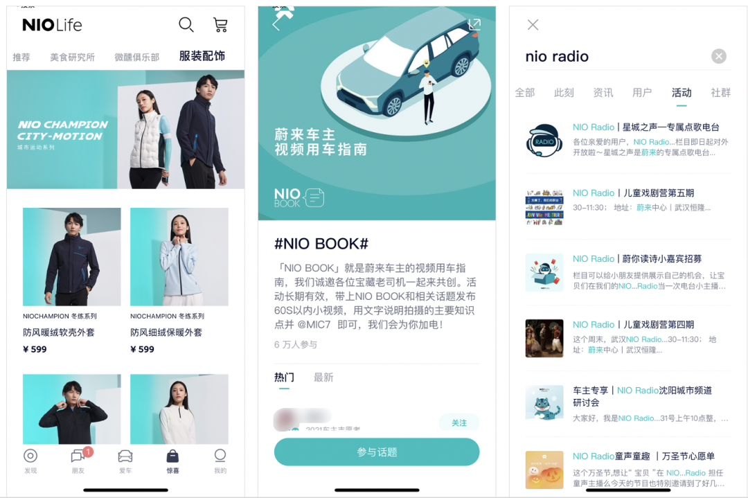 靠內(nèi)容來做留存,對于運營人來說已經(jīng)是老生常談的事情,那蔚來的內(nèi)容有何不同呢?第一,與用戶共建社區(qū)、沉淀內(nèi)容。蔚來 App 上呈現(xiàn)的所有的內(nèi)容,基本都是品牌與用戶共創(chuàng)的結(jié)果:蔚來商城里所售賣的服飾品牌,都是邀請的車主作為模特拍攝宣傳;