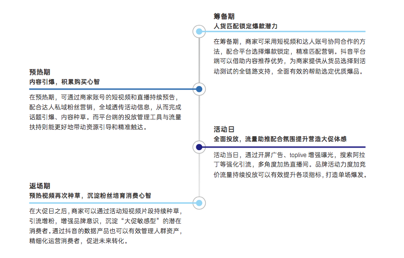 為充分利用大促期間流量資源,商家須在事前按小時甚至分鐘為單位精細打磨直播當天的內(nèi)容規(guī)劃、貨品組合、服務機制以及投放計劃,并在當日按照現(xiàn)場情況靈活應變,抓住機會促成銷量爆發(fā)。