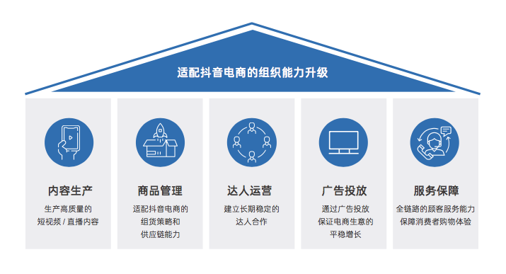 想要領跑抖音電商,商家可以從內(nèi)容、商品、達人、廣告、服務五大基礎維度出發(fā),升級組織架構(gòu)。