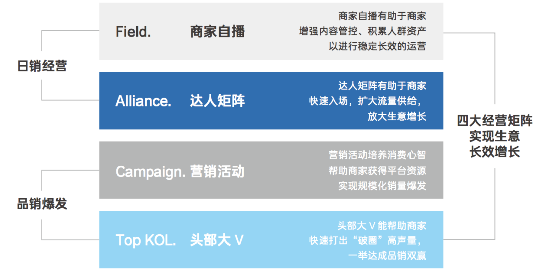 整體上,商家自播(Field)和達人矩陣(Alliance)用于構(gòu)建穩(wěn)定的日常銷量,而營銷活動(Campaign)和頭部大V(Top KOL)用于實現(xiàn)規(guī)模化的品銷爆發(fā)。