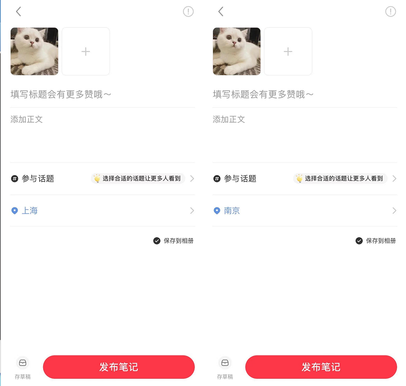 而小紅書的社區(qū)氛圍,并沒有蹭熱點這一說法,大家都是自顧自的發(fā)布筆記,打卡曬照片。小紅書發(fā)布筆記,是能自定義選擇地理位置的,這為賬號運營提供了便利。
