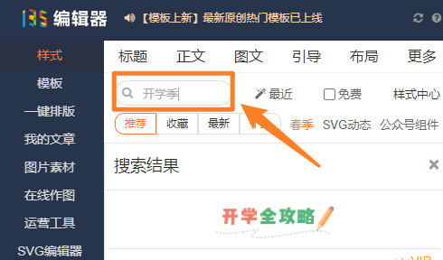 本次上新的開學(xué)季樣式,一共39個(gè)。包含藝術(shù)字、正文、標(biāo)題、引導(dǎo)關(guān)注、圖片、二維碼等多種樣式,在135編輯器內(nèi),搜索關(guān)鍵詞:開學(xué)季,即可使用。