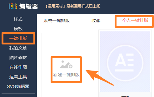 點(diǎn)擊135編輯器左側(cè)的『一鍵排版』-『個(gè)人一鍵排版』,選擇『新建一鍵排版』。