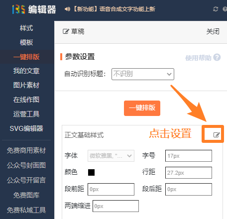 在新建的一鍵排版中,你可以設(shè)置正文的基礎(chǔ)樣式,修改全文字體、字號(hào)、顏色、間距等排版參數(shù)。