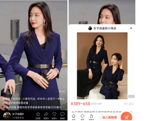 視頻內(nèi)容與商品相一致可以更好的說服用戶購買。比如女子成鑒8中,不同的視頻,模特會身著不同的職場服裝出鏡,而關(guān)聯(lián)的商品也與視頻中模特的服裝相一致,且該賬號劇情內(nèi)容也與職場有關(guān),有顏值有劇情,可以激起用戶的購買意愿。