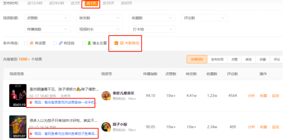 若想了解還有哪些行業(yè)博主在視頻中關(guān)聯(lián)商品,帶貨數(shù)據(jù)如何,可以使用【友望數(shù)據(jù)】-【熱門視頻】。通過篩選【關(guān)聯(lián)商品】,可以獲得近12小時/近24小時/近3天/近7天/近30天/近60天的數(shù)據(jù)。比如通過篩選,可以發(fā)現(xiàn)近7天有關(guān)聯(lián)商品的視頻多達1000+,不少博主在視頻中關(guān)聯(lián)商品進行帶貨。其中,在搜索結(jié)果的前10條視頻中,掛鏈美食飲品商品的視頻占據(jù)4條。