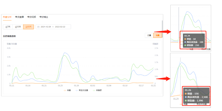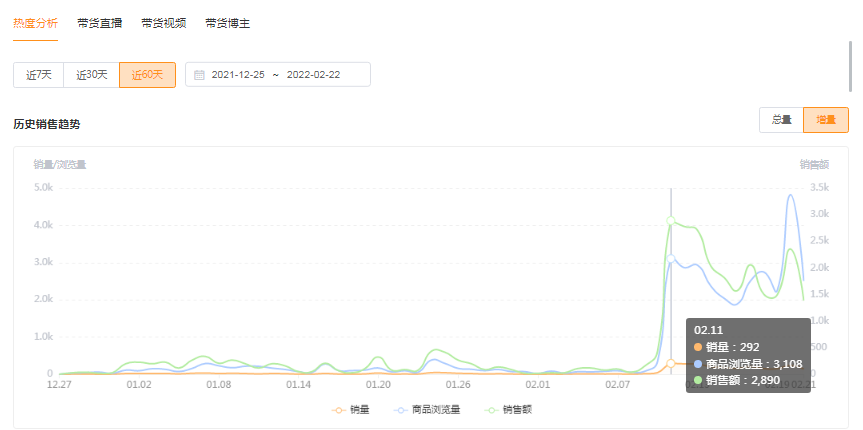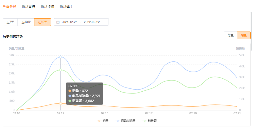 △截圖來源:友望數(shù)據(jù)-關(guān)聯(lián)商品詳情頁從【熱度分析】歷史銷售趨勢可以看到從2月10日至2月12日,2月13日至2月15日該商品預估銷量、瀏覽量以及預估銷售額呈上升趨勢,特別是2月10日至2月12日,僅12日當日的預估銷量就達到372,預估銷售額3682。