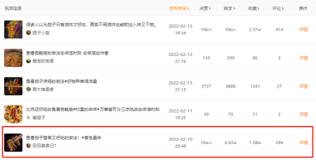 △截圖來源:友望數(shù)據(jù)-關(guān)聯(lián)商品詳情頁而在【帶貨視頻】中可以看到2月10日,田田美食記T在發(fā)布的“魚香茄子簡單又好吃的做法”視頻中關(guān)聯(lián)了該商品,目前這條視頻點贊數(shù)達到了10萬+。