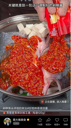 許多美食博主在美食教學過程中也會使用關(guān)聯(lián)的商品。比如美食博主黃大維美食一條視頻關(guān)聯(lián)剁椒王醬商品,在制作菜品的過程中也使用了該商品,并用“關(guān)鍵”一詞跟用戶強調(diào)剁椒醬的重要性。