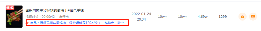 △截圖來源:友望數(shù)據(jù)-關(guān)聯(lián)商品詳情頁從【帶貨直播】可以發(fā)現(xiàn)該時間段并沒有博主帶貨該商品,從【帶貨視頻】可以發(fā)現(xiàn)24日該博主發(fā)布了一條“回鍋肉簡單又好吃的做法”,這條視頻點贊、轉(zhuǎn)發(fā)均達到10萬+,視頻的廣泛傳播也在一定程度上帶動了商品數(shù)據(jù)。