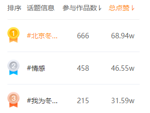此外,也可以在視頻中添加熱門話題標簽增加視頻的曝光度,比如在【友望數(shù)據(jù)】-【熱門話題】通過【總點贊】進行篩選可以發(fā)現(xiàn),近期#北京冬奧會 #情感 #我為冬奧喝彩 點贊數(shù)較高。博主要根據(jù)自己內(nèi)容來添加相應的標簽,盲目添加反而起反效果。