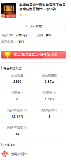 直接點擊商品(藍色字體)即可跳轉(zhuǎn)到該商品的詳情頁面。以“秦媽魚香肉絲調(diào)料”為例,從詳情頁可以了解該商品的預估銷量、銷售額以及一些其他數(shù)據(jù),比如瀏覽量達到1.97萬,有8位博主帶貨,關(guān)聯(lián)視頻達到5條,關(guān)聯(lián)直播次數(shù)達到了14次。