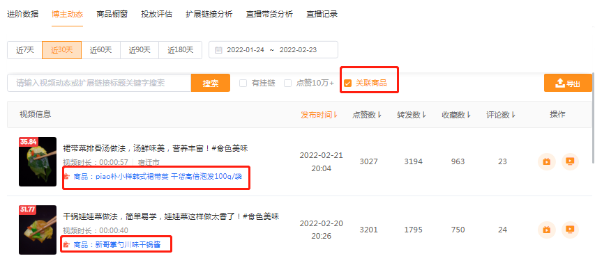 由于該功能與視頻直接關(guān)聯(lián),因此視頻內(nèi)容的質(zhì)量、傳播范圍的大小也會影響商品是否會被更多人看到,在此可以給大家3個技巧(僅供參考):視頻點贊、轉(zhuǎn)發(fā)越多,那么關(guān)聯(lián)的商品就有更大機率被消費者看到,因此可以嘗試打造被更多用戶傳播的內(nèi)容。那么什么樣的內(nèi)容更受用戶的喜歡?可以通過【友望數(shù)據(jù)】-【熱門視頻】及【飆升視頻】,了解各行業(yè)哪些內(nèi)容傳播度高,分析被用戶喜歡的因素有那些,當然博主要根據(jù)自己的賬號屬性來打造內(nèi)容。
