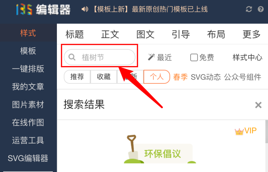 本次上新的植樹節(jié)樣式,一共23個。包含正文、標(biāo)題、引導(dǎo)關(guān)注、圖片、二維碼等多種樣式,在135編輯器內(nèi),搜索關(guān)鍵詞:植樹節(jié),即可使用。