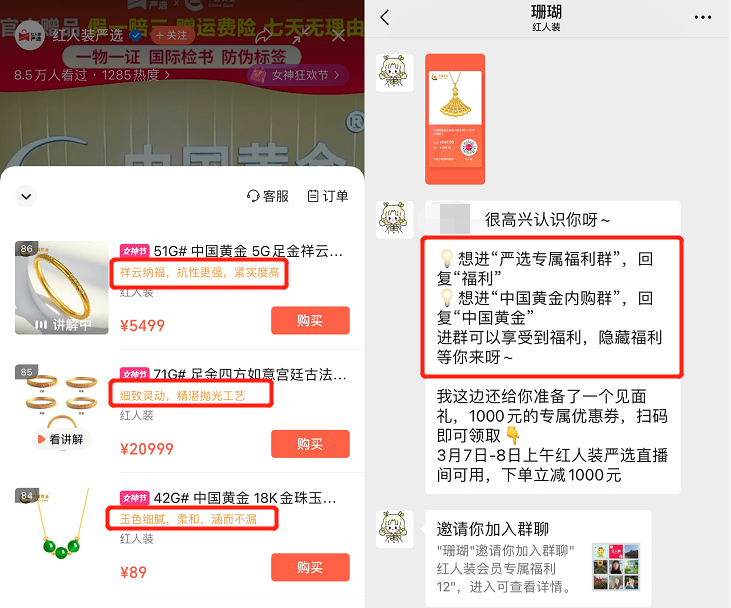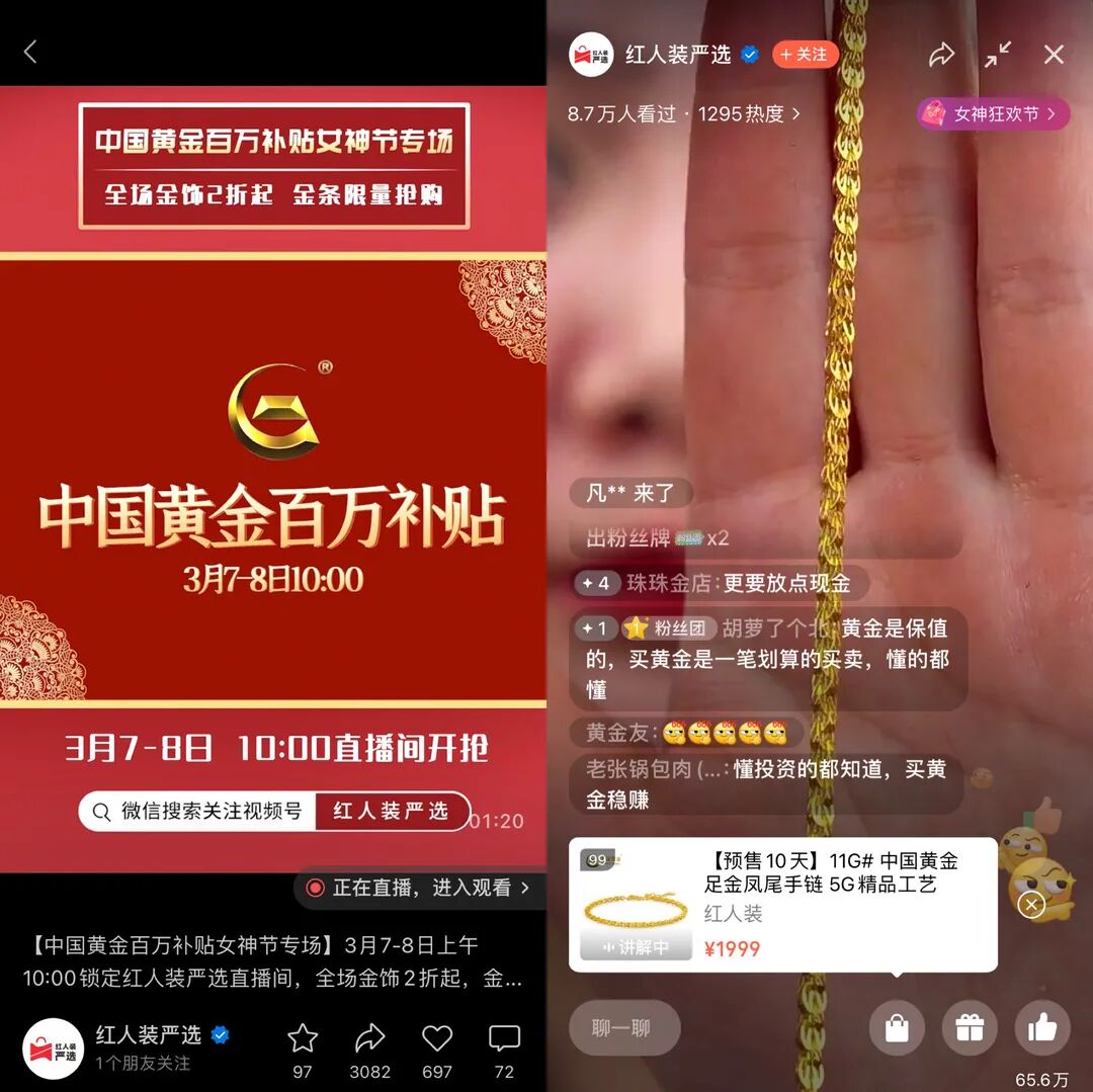 在文章開篇的官方榜單中,紅人裝嚴選也在列。3月7日-8日,紅人裝與中國黃金合作開展2天的百萬補貼專場直播。