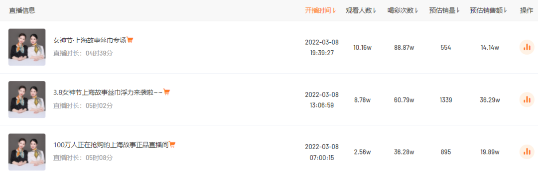 以錦帛緣香云紗為例,3月3日-3月8日3·8活動期間,5天直播14次,場均觀看7.52萬人,預估直播銷售額超200萬。