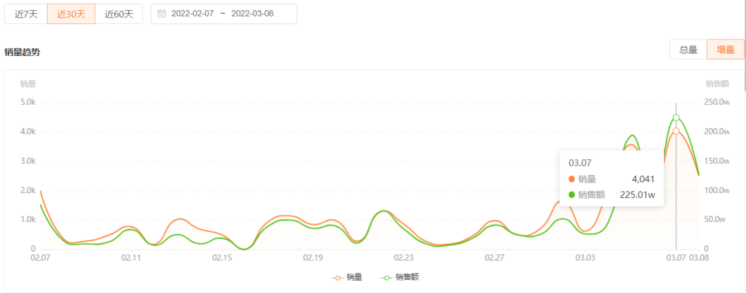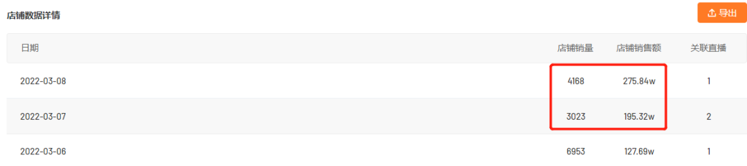 不過該店鋪綁定的主播還有另外一個賬號嫣妝街真絲香云紗。在近30的店鋪銷量中可以明顯地看到,3·8活動期間該店鋪預估銷量和預估銷售額都暴增。最高的為3月7日當天,店鋪預估銷量超4000件,預估銷售額高達225萬。
