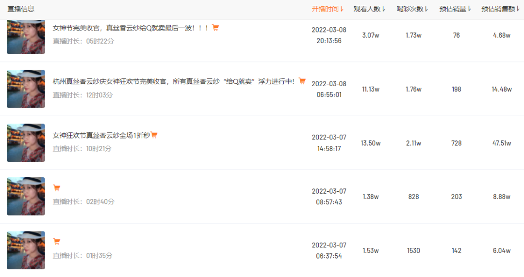 從具體的【直播記錄】中可以看到,錦帛緣香云紗活動期間一天直播時長在15-17個小時左右,1天2場或者1天3場,也是下足了功夫在帶貨。