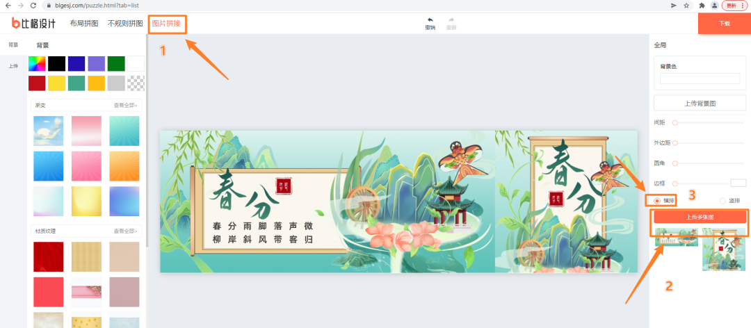 通過(guò)比格設(shè)計(jì)??在線拼圖,選擇圖片拼接??上傳多張圖??橫排制作為一張封面圖
