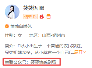 2個(gè)月前笑笑開始運(yùn)營公眾號(hào)笑笑情感劇場(chǎng),并利用視頻號(hào)為公眾號(hào)導(dǎo)流,比如在視頻號(hào)主頁關(guān)聯(lián)公眾號(hào)、用公眾號(hào)身份直播等方式。
