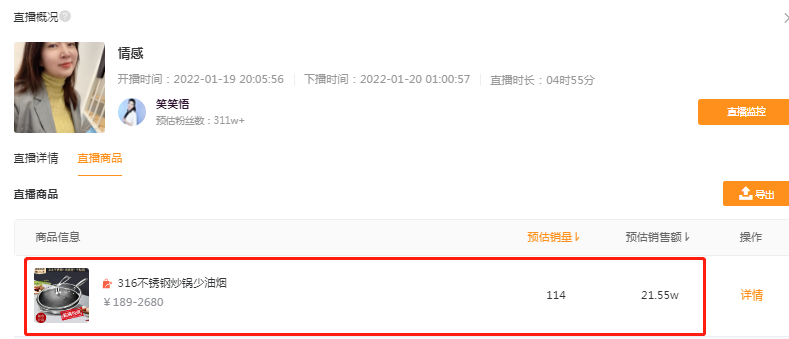在1月19日的一場(chǎng)帶貨直播中,這個(gè)產(chǎn)品預(yù)估銷售額達(dá)到了21.55萬。