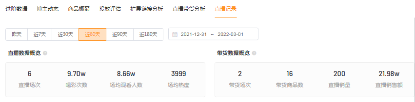 由于把更多精力用在內(nèi)容上,笑笑直播較少,直播內(nèi)容主要是與用戶談心聊天,并不會(huì)特意去準(zhǔn)備策劃。在【友望數(shù)據(jù)】-【直播記錄】中,可以發(fā)現(xiàn)近60天,笑笑僅直播6場(chǎng),其中有2場(chǎng)直播帶貨。