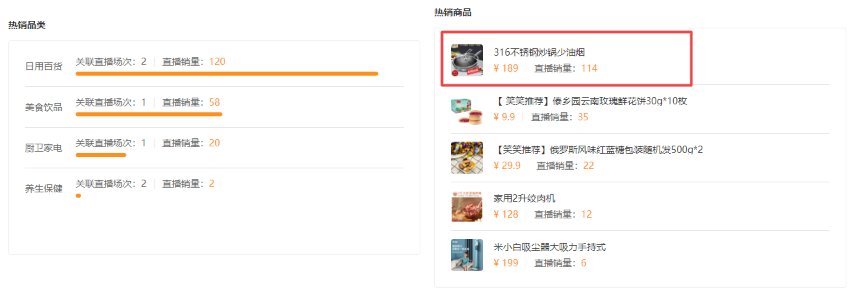 從【直播帶貨分析】可以了解到這2場(chǎng)帶貨直播帶貨品類涉及日用百貨、美食飲品、廚衛(wèi)家電、養(yǎng)生保健,其中“316不銹鋼炒鍋少油煙”最為暢銷。