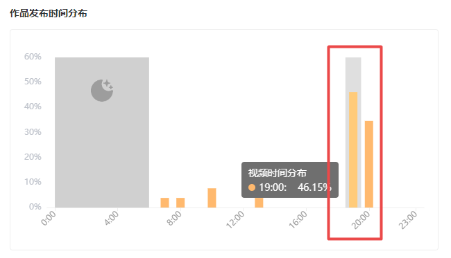 此外,通過【作品發(fā)布時(shí)間分布】也可以發(fā)現(xiàn)笑笑悟賬號(hào)發(fā)布時(shí)間一般是在晚上7點(diǎn)或8點(diǎn),其中7點(diǎn)占比46.15%。
