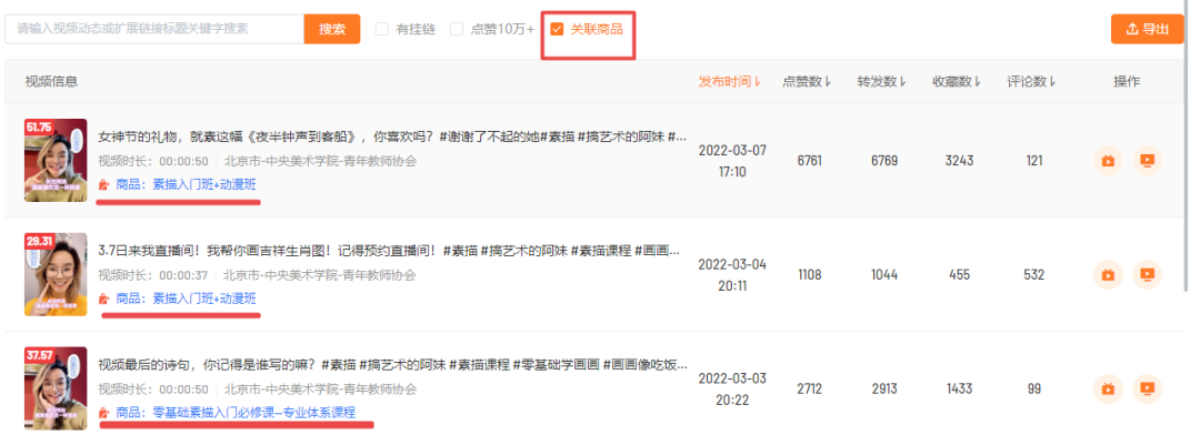 除了直播帶貨,搞藝術的阿妹也會在視頻中關聯(lián)購物車來帶貨變現(xiàn)。通過【友望數(shù)據(jù)】-【博主動態(tài)】可以發(fā)現(xiàn)該賬號近30天發(fā)布18條作品,平均點贊3.96萬,每條作品博主都會掛上購物車鏈接,視頻的高曝光也有助于提高商品的瀏覽量,觸達更多消費人群。截圖來源:友望數(shù)據(jù)-博主動態(tài)