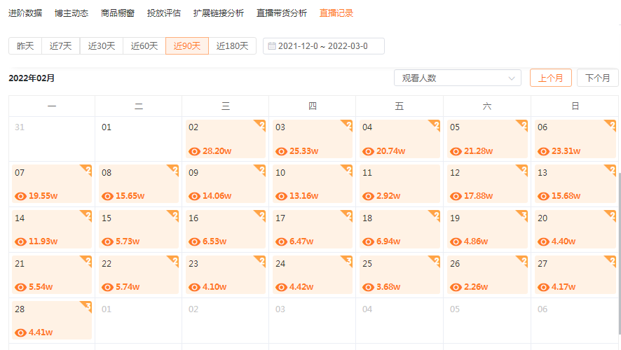 清楓書畫同樣也是直播書法家提筆揮墨的過程,古老的書法藝術加上古典悠揚的古箏音樂,將直播間藝術氛圍拉滿,不少用戶稱贊“漂亮”寫的不錯"。直播中,書法家一般只負責創(chuàng)作,由幕后工作人員進行解說,并為用戶答疑解惑。相比于已經(jīng)成熟且競爭激勵的抖快直播帶貨平臺,視頻號直播還在完善優(yōu)化中,且背靠微信巨大體量蘊藏的無限可能吸引越來越多藝術博主在視頻號直播。通過【友望數(shù)據(jù)】-【直播日歷】可以發(fā)現(xiàn)許多藝術博主直播頻率較高,比如蔣占紅,在2月幾乎每天都有直播,有時一天直播2場。高頻直播可以輻射更多人群。△ 截圖來源:友望數(shù)據(jù)-直播日歷