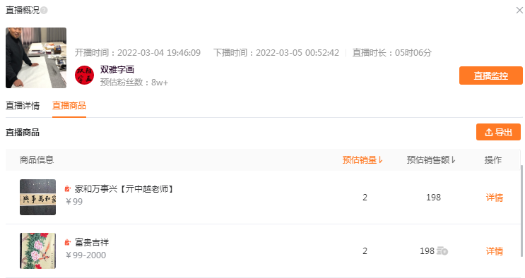 直播的盡頭是直播帶貨,藝術類直播也是如此。早期,書畫作品購買途徑主要有書畫店、拍賣會、畫廊等通過線下方式購買。隨著互聯(lián)網(wǎng)發(fā)展,用戶可通過網(wǎng)絡購買,更加便捷方便,而如今直播帶貨的大火更進一步拓寬了書畫作品的銷售渠道。通過【友望數(shù)據(jù)】-【直播記錄】我們可以發(fā)現(xiàn)許多藝術博主幾乎每一場直播都會帶貨,比如雙雅字畫31場直播中有29場直播帶貨,帶貨產(chǎn)品主要為書法作品。截圖來源:友望數(shù)據(jù)-直播概況