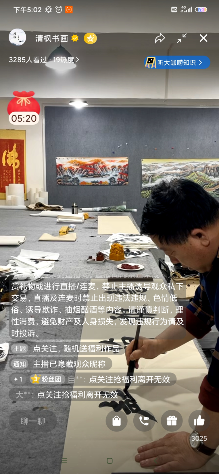 相比于抖音,視頻號用戶群體年齡偏大,對藝術文化類這種可讀性強具有收藏價值的內容或許會更感興趣。通過直播,就可以沉浸式觀摩博主藝術創(chuàng)作的全過程,滿足好奇心的同時也可以學習干貨知識。另外,這類群體對書畫作品也具有一定的消費能力,且在藝術領域,用戶黏性較強,具有一定的重復消費性,一旦認準,就會再次購買。不少博主在直播中設置福袋福利來活躍直播間氣氛,延長用戶直播間存留時間,比如搞藝術的阿妹,在開播不久后,就會設置現(xiàn)金紅包,并需要在直播間留言才可以參與。△ 直播福袋
