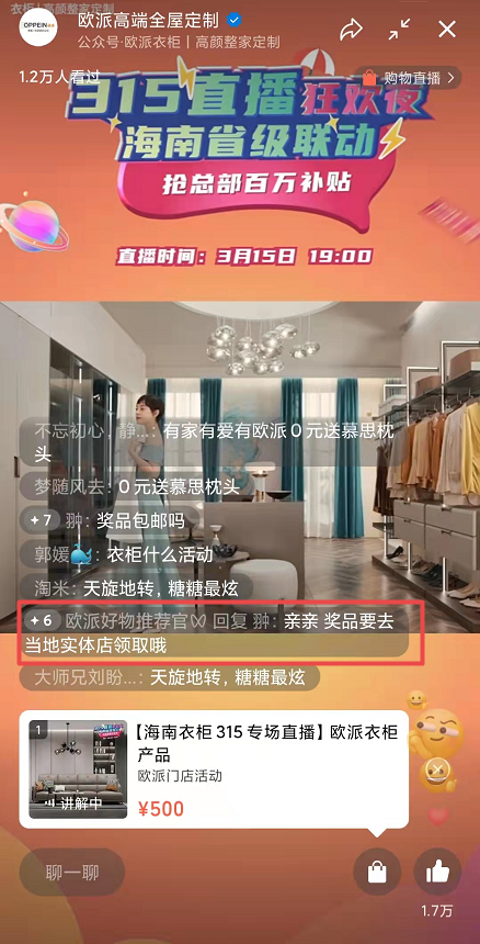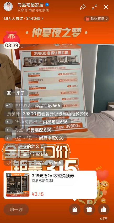 今年3·15,一些家居品牌也通過視頻號直播進行帶貨。比如瑪格定制家居,在3月4號就開啟“瑪格315·與冠軍同行——冠軍盛典直播夜”活動。