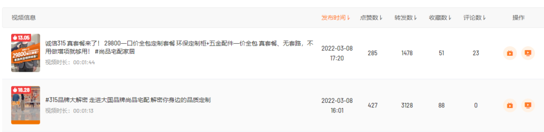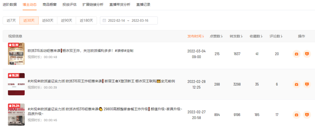 我們發(fā)現(xiàn)有的品牌也通過視頻號為3·15活動預(yù)熱,以家居品牌歐派高端全屋定制為例,在【友望數(shù)據(jù)】-【博主動態(tài)】中的搜索框輸入“315”,可以看到該品牌早在2月18日就開始為3·15活動預(yù)熱,宣傳品牌產(chǎn)品品質(zhì)及活動優(yōu)惠的力度。