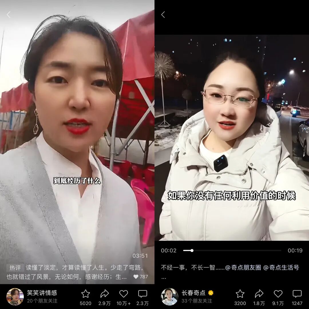 位于情感領(lǐng)域頭部的視頻號博主笑笑悟、長春奇點,二人都是素人出身,沒有專業(yè)的團隊、沒有專業(yè)的設(shè)備,一臺手機一個人,走到哪拍到哪,真人出鏡、真情實感、真實環(huán)境,將自己的人生感悟、生活的酸甜苦辣通過鏡頭傳達給用戶,直擊人心,也傳遞著力量。