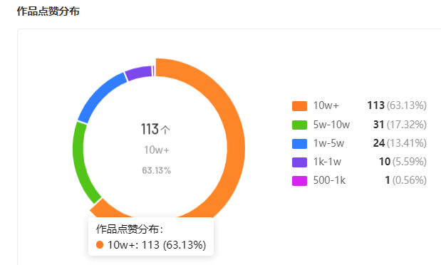 以笑笑悟為例,2020年11月入局視頻號至今,收獲了近300條點贊10W+視頻。從她的【作品點贊分布】來看,近180天179個作品中,點贊10W+占比63.13%。點贊5-10W作品數(shù)占比17.32%,二者之和超過80%。據(jù)笑笑透露,目前視頻號關(guān)注用戶340多萬。