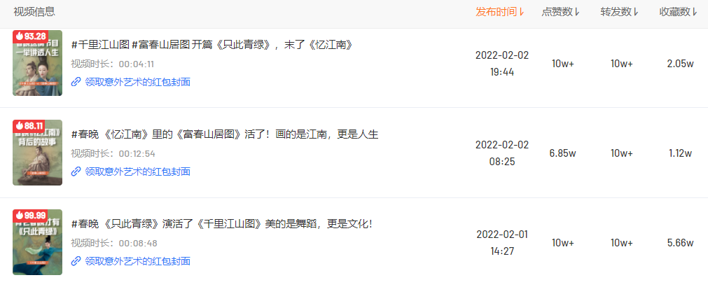 春晚后,《只此青綠》沖上熱搜。藝術(shù)博主意公子迅速結(jié)合熱點,2月1日-2日兩天事件制作發(fā)布了3條相關(guān)內(nèi)容,這3條視頻時長最短的4分11秒,最長的近13分鐘,3條內(nèi)容都10W+。
