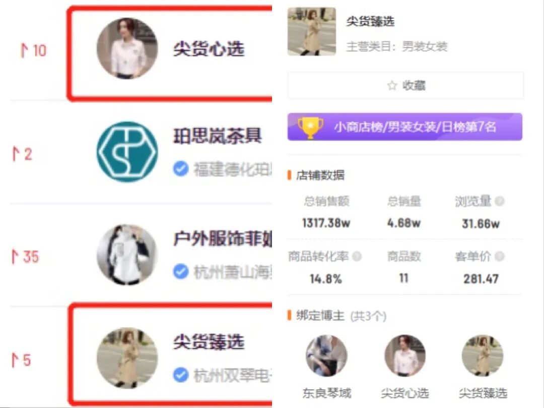 果不其然。友望數(shù)據(jù)通過其綁定店鋪,發(fā)現(xiàn)是同一家,除此以外還有東良琴域,共三個矩陣號。其中尖貨心選和東良琴域都是近期剛開播的賬號。尖貨心選3月16日開播,東良琴域則3月21日才開播。