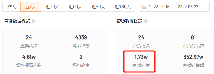 從尖貨心選近7天的直播數(shù)據(jù)可以看到,直播預(yù)估銷量高達(dá)1.73萬件,銷量可觀。