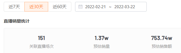 △ 截圖來源:友望數(shù)據(jù)-店鋪詳情這些綁定的博主,近7天共直播了151次,預(yù)估銷量1.37萬件、預(yù)估銷售額753.74萬元。